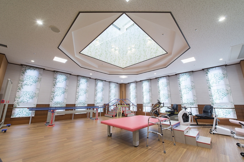 事業内容は入所療養施設と通所リハビリテーションを主軸としており、療養室は従来型(1階:60人)とユニット型(2階:4ユニット×10人)に分け、利用者の状態に合わせたバリエーション豊富なプランを提供し、無駄のない職員動線に配慮した平面計画をおこないました。