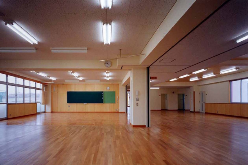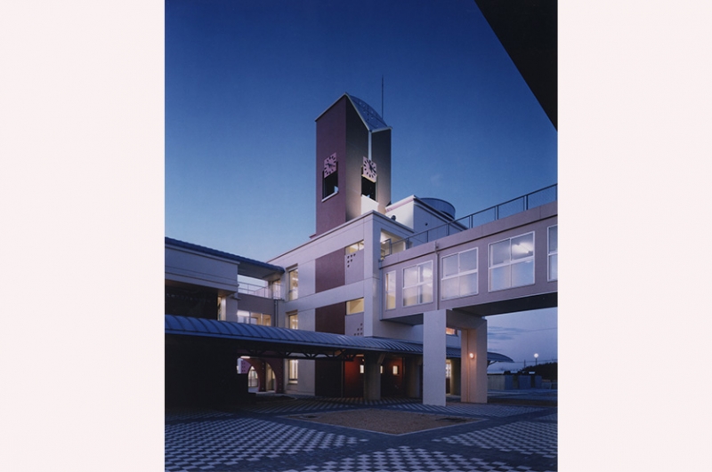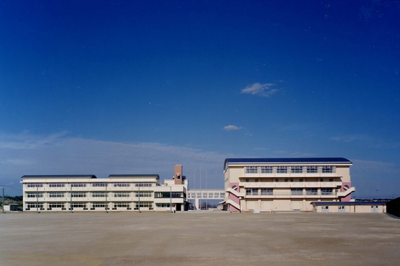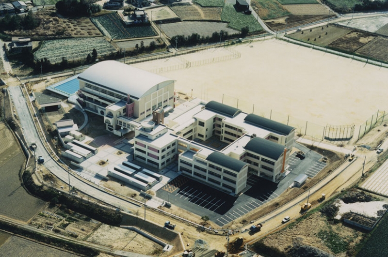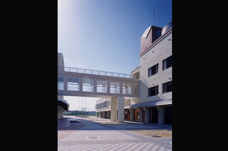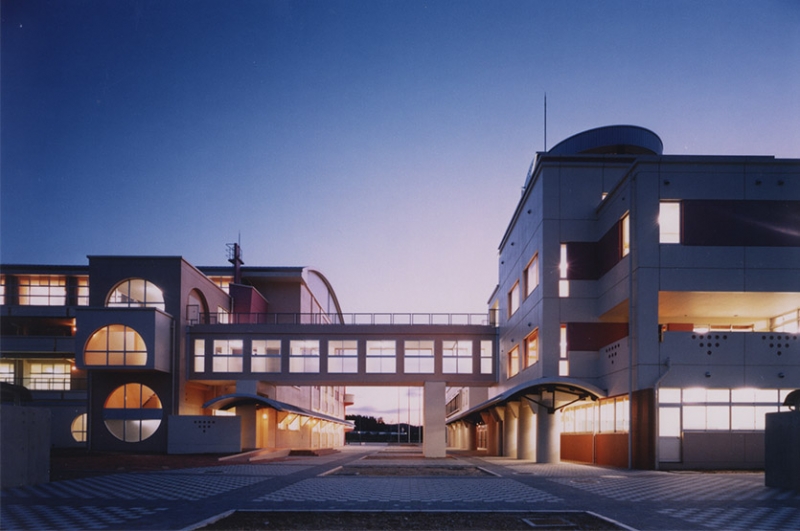 設計コンペ当選案をもとに、教育委員会・教職員との協働で設計を進めました。校舎敷地の中央に設けたコンコースにより学習ゾーンと体育ゾーンを明確に分離し、地域開放に対応しました。体育施設は3層の構成でコンパクトにまとめました。両ゾーンは、空中通路で繋ぎました。教室棟は中央に中庭を持つ回廊形式を採用し、内部空間の変化や外部の景色を意識しながら、教科ごと校舎内を移動する楽しさを演出しました。
