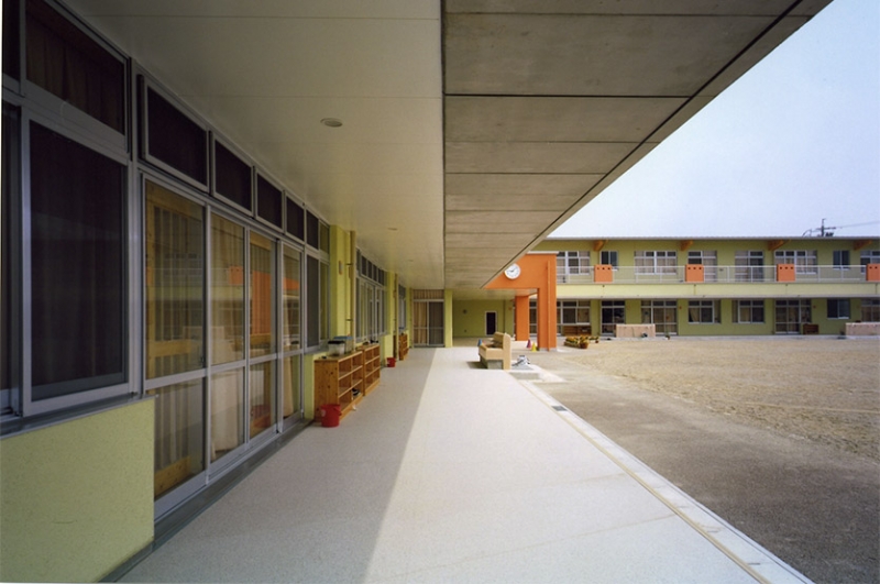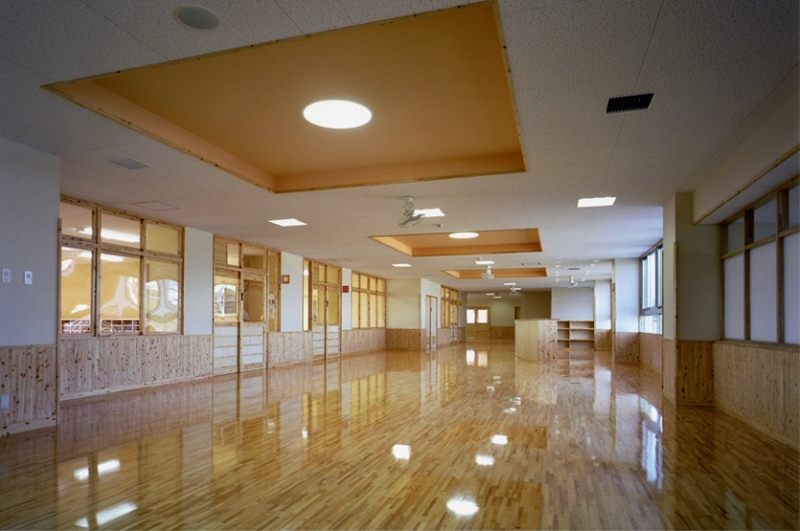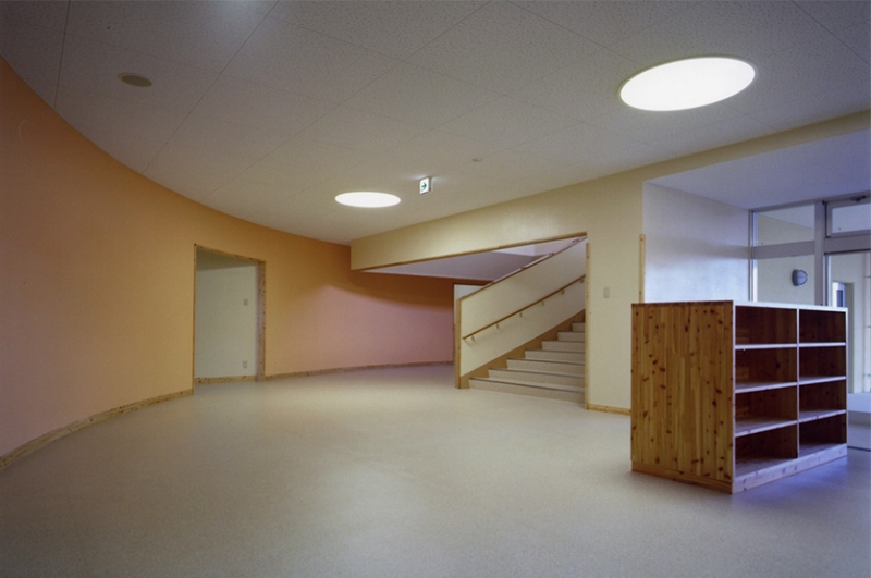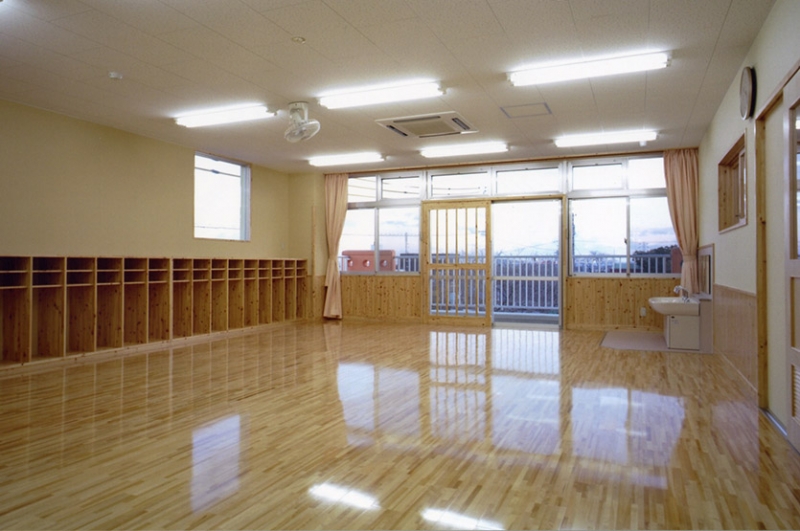 園庭を取り囲むようにテラスを配置し、雨天でも遊べるよう奥行き3mの軒下空間となるようにしました。内部は腰壁及び家具等に間伐材を使用し、温かみのある空間となるよう配慮しました。また細部にいたるまで園児にとって危険な箇所が無いよう各部の納まりを検討しました。