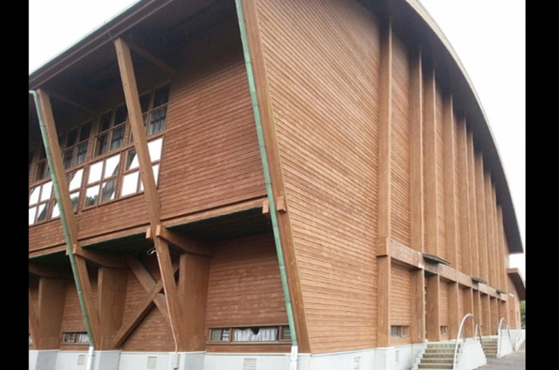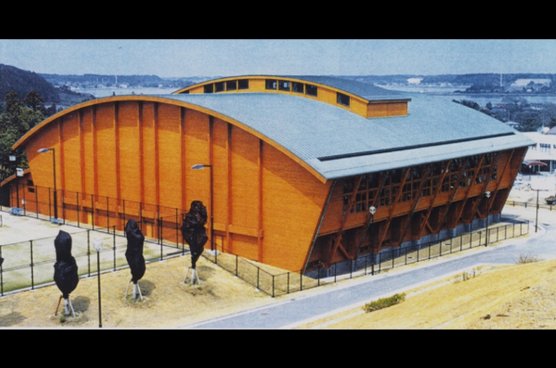 市街地高台に設置されており、北浦を一望できる条件にもあり、下から望まれる位置にあるとも言えます。体育館は、34.6mで、米マツ集成材を使用しており、曲面の多い外観は、ひときわ優美な趣を呈し、町を代表する中核施設になっています。その他の内装にも県内産のヒノキとスギを多用しました。