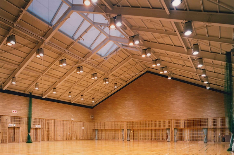 体育館のトップライトは、一日中安定した光を採るためにテフロン膜による均一な採光。