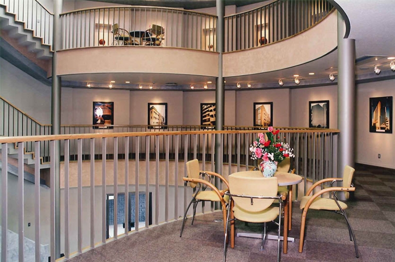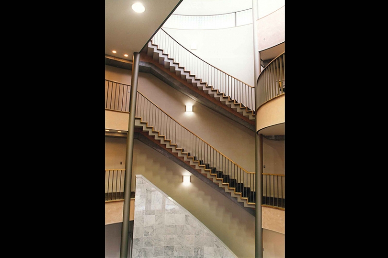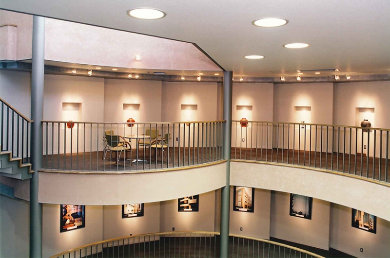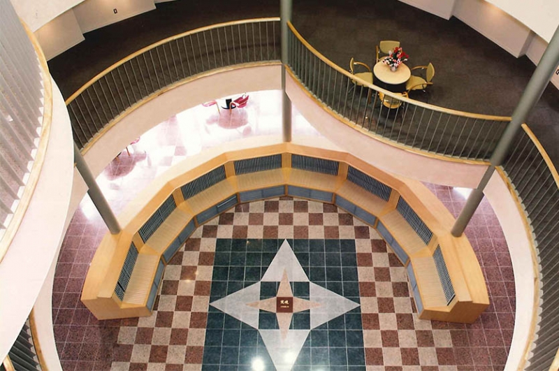 円筒形のショールーム棟は4層吹き抜けとなって、らせん状の階段の踊り場をギャラリーとして利用し、タイルのサンプルを自然に近い光で見ることができるようトップライトにテント幕を採用、サンプル収納は吹き抜けの形状に沿ったものにしました。