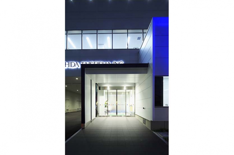 外観は石田大成社のイメージカラーであるコスモブルーを基調に全体をまとめ、東西面は敷地形状に合わせた形体としました。