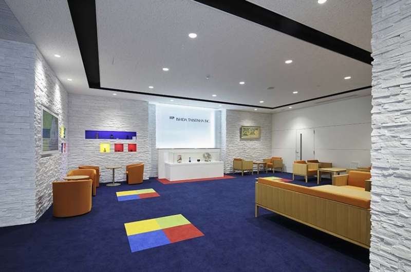 内部のエントランスホールも床はコスモブルーを基調とし、ポイントでアクセントカラーを配置し、壁は擬石を使い高級感のある雰囲気づくりを心掛けました。