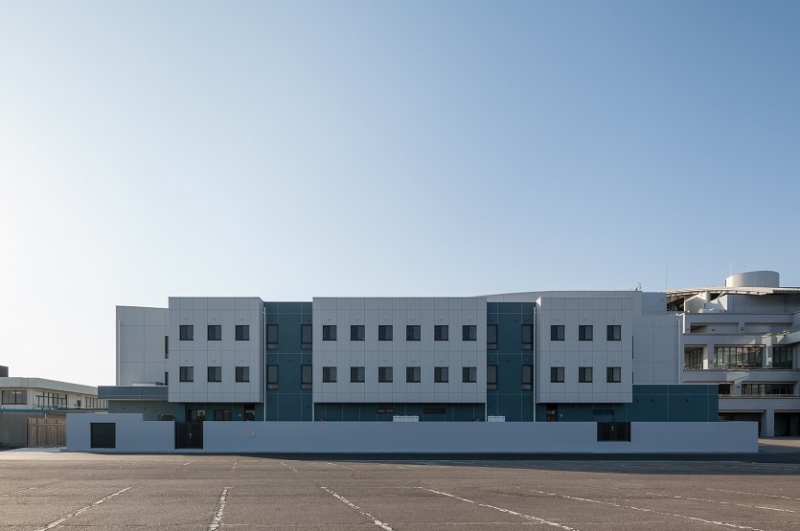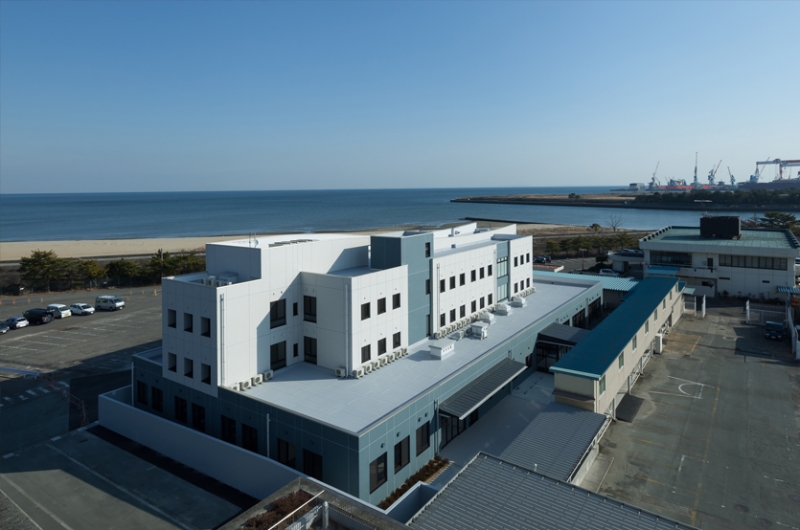 海に近い施設のため、外部に配置した設備機器類は耐重塩害仕様とし、外壁は全てタイル張りとしました。また屋上の設備機器の目隠し壁をゆるやかなカーブで立上げ、波をイメージさせるような外観としました。