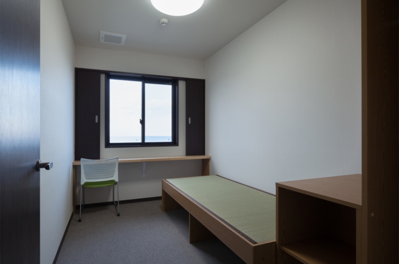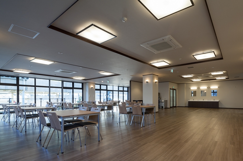1階は事務所部門と選手部門に分かれていますが、それぞれ別の入口を設けることで、レース中に他者との接触が制限される選手の管理を容易に行えるように配慮しました。事務所部門は事務室及び会議室(50名)等で構成されており、選手部門とは施錠可能な扉により区画されています。選手部門は1階に食堂、風呂等の共用部及び監督室等の管理部門、2・3階に居室をそれぞれ30室ずつ配置しました。居室は全て個室としましたが、3室毎に談話室及び洗面を設け、選手のプライバシーを確保すると共に休息の時間をリラックスして過ごせる様に配慮しました。