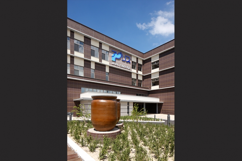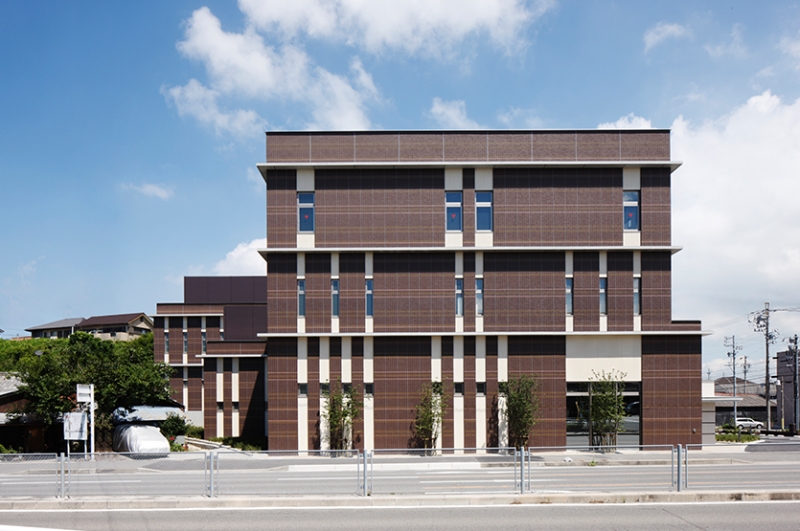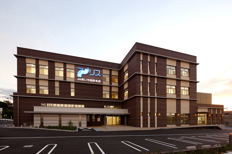 JAあいち知多本店の津波対策として高台への移設による新築工事。常滑の散歩道のスタート地点となる場所であり常滑らしい色合い・地層をイメージし焼酎瓶の擁壁で常滑の街並みに溶け込むよう心がけました。