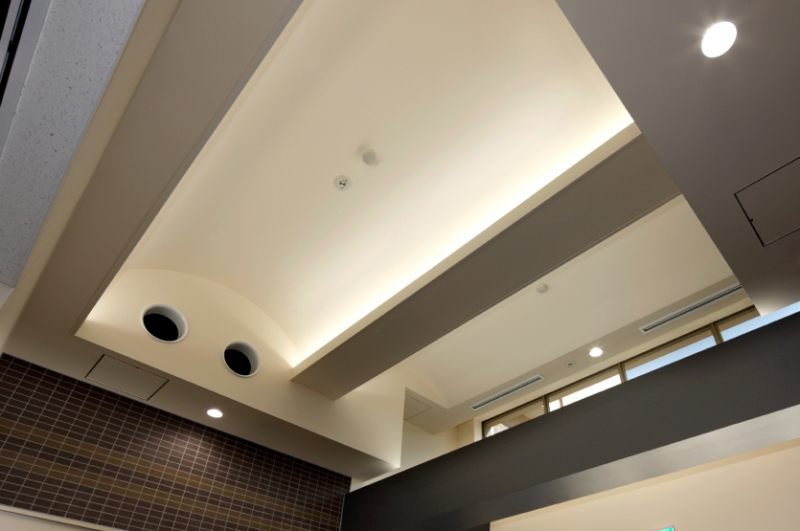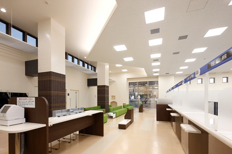 お客様を向かいいれるエントランス(ATMコーナー)は登り窯をイメージし金融営業室の天井高を高くし解放感あるようにしています。