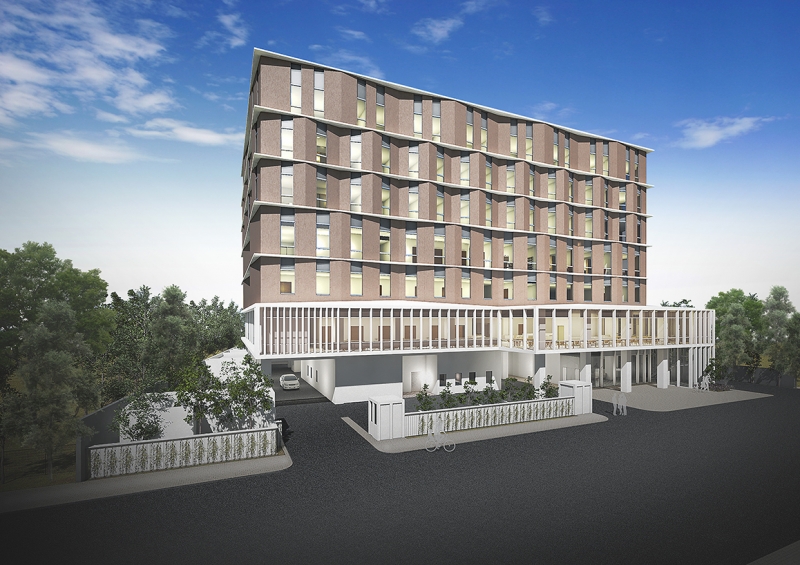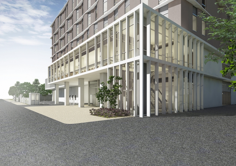 利用者のみでなく、周辺に住む住民にも親しみを持って貰える外観、内観設計。地域カラーに溶け込みやすい外壁色とし、正面に垂直ルーバーを採用し表情豊かなで印象深いファサード形成すると共に、環境負荷を低減させエネルギーの高効率な建物とします。張り出したスラブは南国の強い日差しやスコールを遮り、ランニングコストを抑える助けとなるだけでなく、雨やカビによる汚れから建物を守る役割も担っています。
