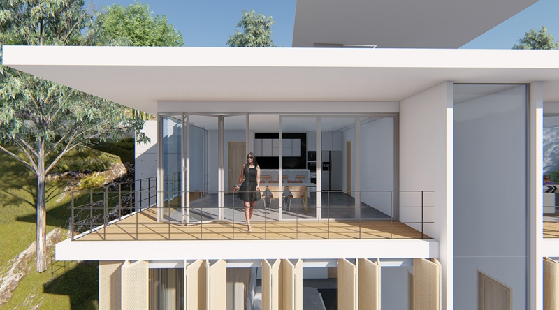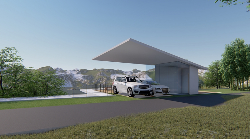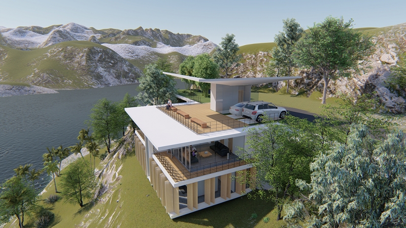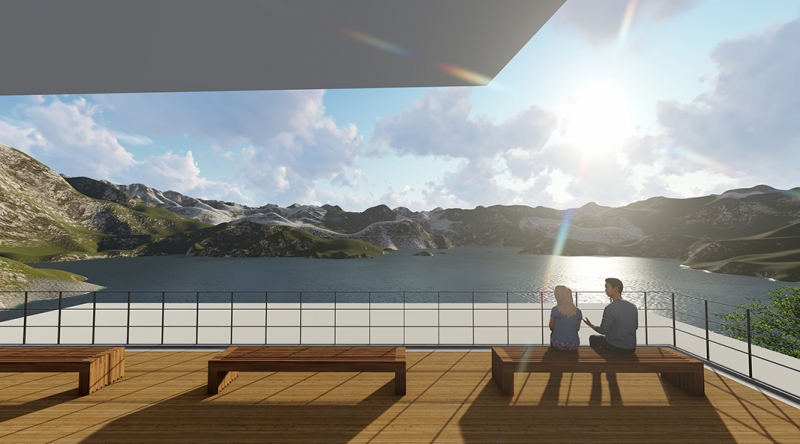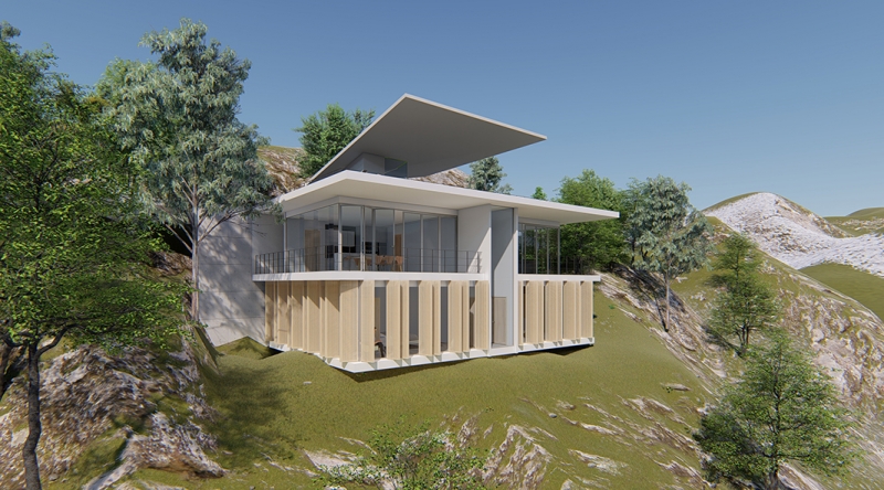 豊かな外部環境を包含する生活を可能とする平面計画。木製ルーバーにより外部の視線を遮り、プライバシーを守りつつ周辺の山と湖を感じられる諸室。回遊性のある動線、地形に沿った段差と張り出したスラブ、屋内外の同一の仕上げ材料、視覚的に連続するシンプルに徹した納まりによって自然と建物が曖昧につながれます。
