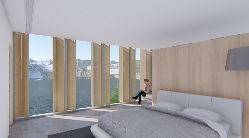 目の前に広がる豊かな森、湖、様々な傾斜や棚田。ここで建物内の空間をつくる要素は「風景」です。 豊かな自然を最大限感じられるような開口、傾斜に沿って配置された床。これらの要素によってできる室内空間は、この場所でしか体験することのできない居住空間を生み出します。