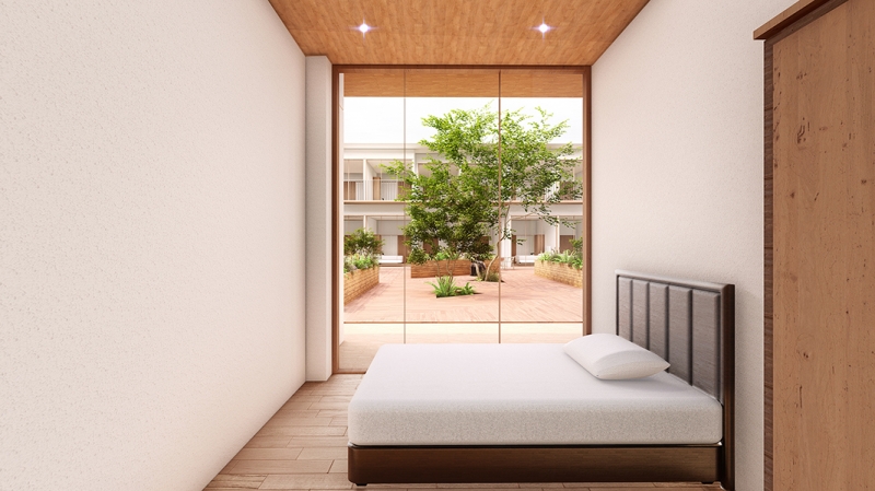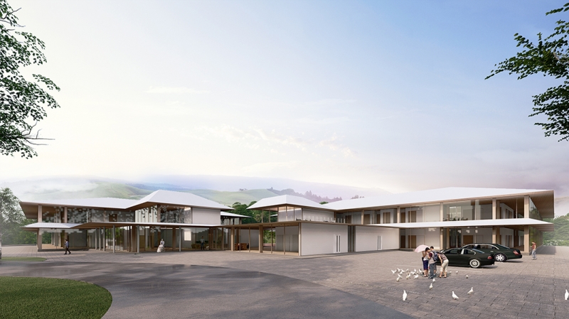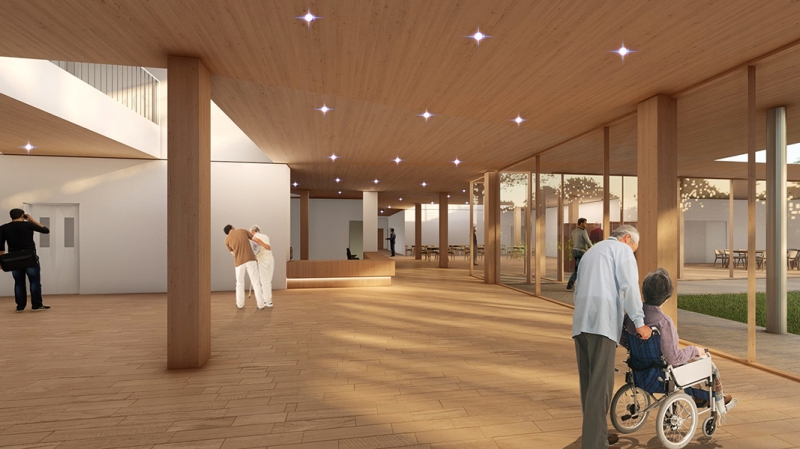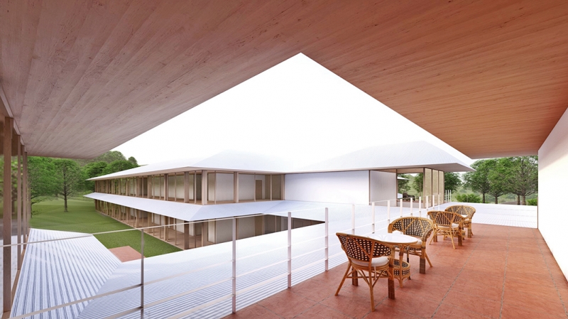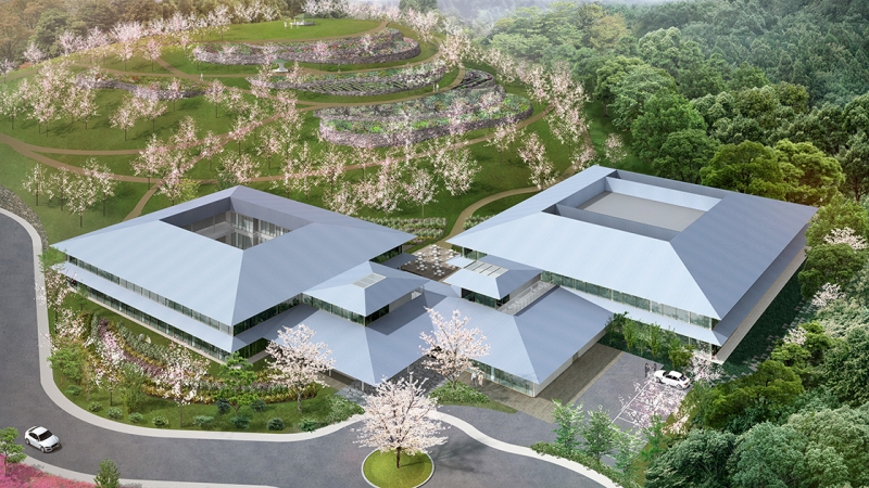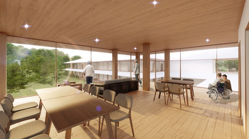 周辺の豊かな自然から突出しないように、周囲の山々の起伏とともに、建物が風景に「浸潤」させるような立面構成とし、中庭だけでなく、外部にも大きく開くことで周辺の緑と一体となって季節や天気の変化も楽しめるような施設となります。