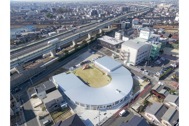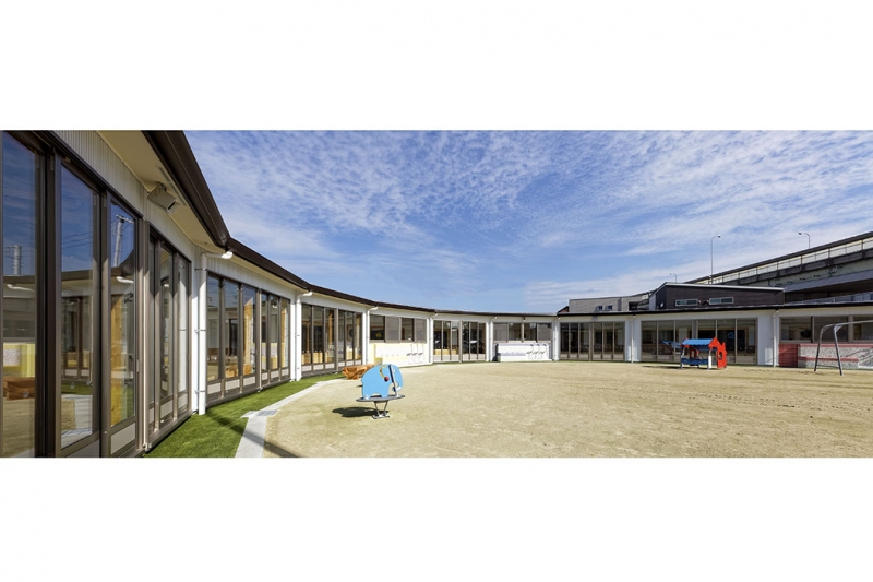 全ての保育室と職員室が園庭を介して対面でき単純明快な導線となるプランとし、一体感を生み出すまあるい園庭を形成しました。この園庭は住宅地を避けた南側に開放し、近隣の日常生活影響にも配慮しております。敷地内に乳児用の園庭を別に設けることで、年齢・目的に合わせて屋外活動が出来るよう安全配慮の配置計画としました。