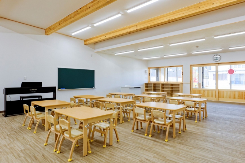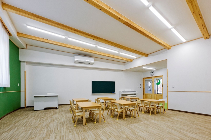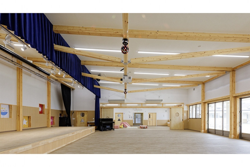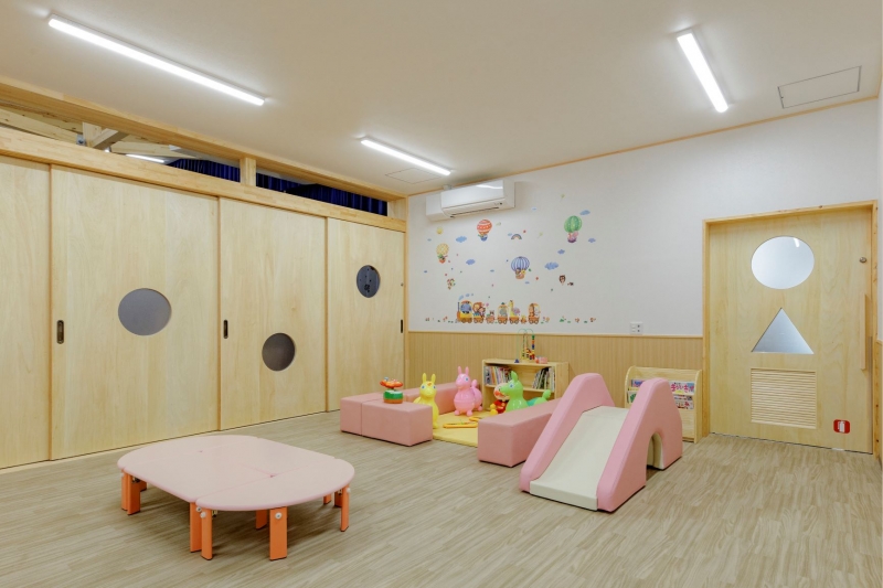 こども達が毎日通園するのが楽しくなるようなプランニングを心掛け、シンプルな色調の中ににぎやかなポイント色を加えた内外装となっております。