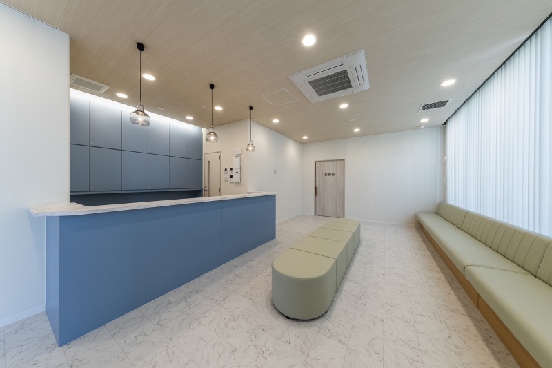 内部は待合室の壁一面を窓とし、光を多く取り込み、明るく、清潔感が感じられるように内装とともに計画しました。