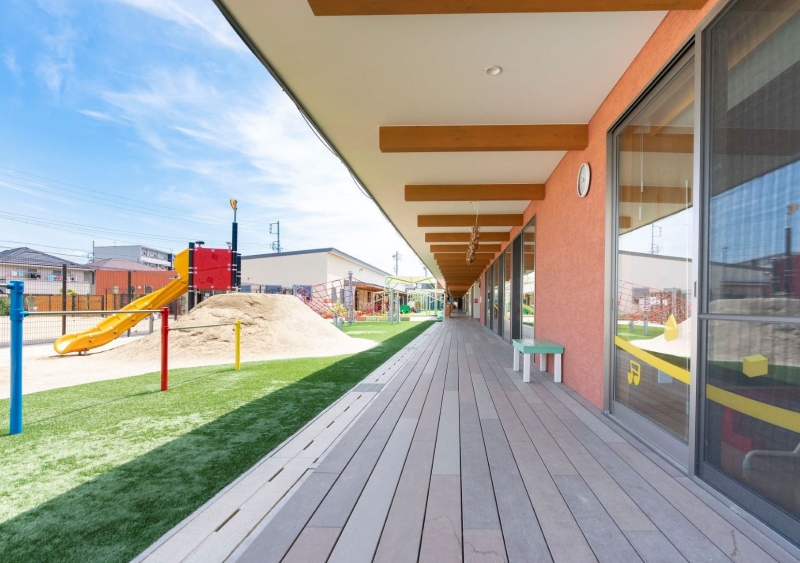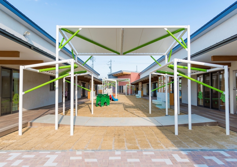 園児数180人を定員としたこども園の計画で、木造準耐火構造平屋建ての園舎を2棟南北に平行に配置し、挟まれた中庭に面した直線状のデッキテラスが特徴です。