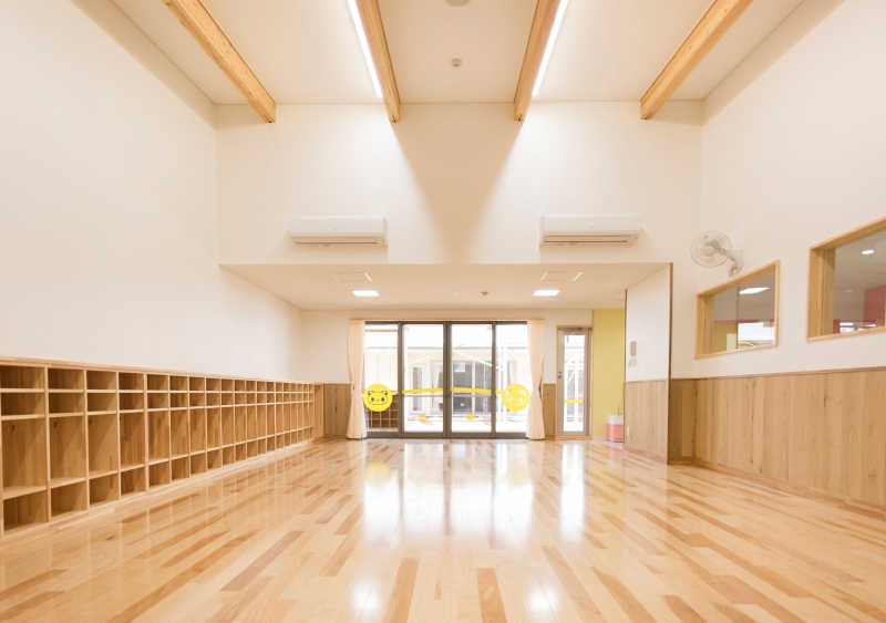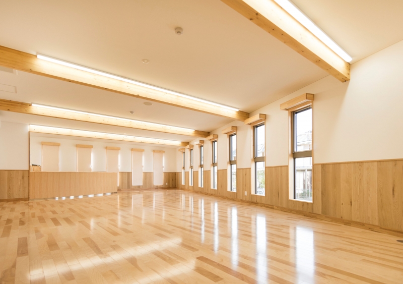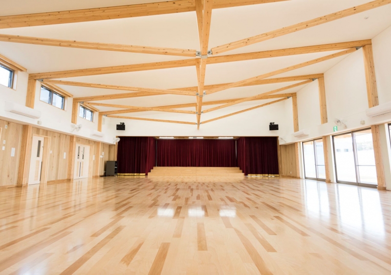 耐火性能を確保しつつ木造ならではのあたたかみを損なわないために、外部テラスの片持梁等、できる限り木材をあらわしにしています。遊戯室については張弦梁を採用し、木造ながら10mスパンの無柱空間を実現しています。