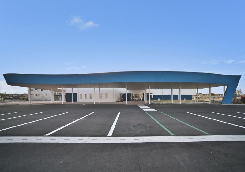 青く波打つ形状のキャノピーは武豊町に残る浦島伝説にまつわる天女の羽衣から着想されたもので、風にたなびく柔らかなイメージと運動施設としての躍動感を表しています。