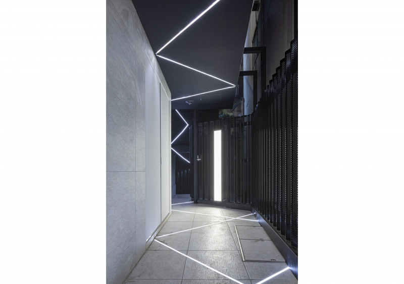 地下1階店舗へのアプローチは、ライン照明を多方向に構成することで、甲州街道を通る多様な人々を自然に地下へと導きます。