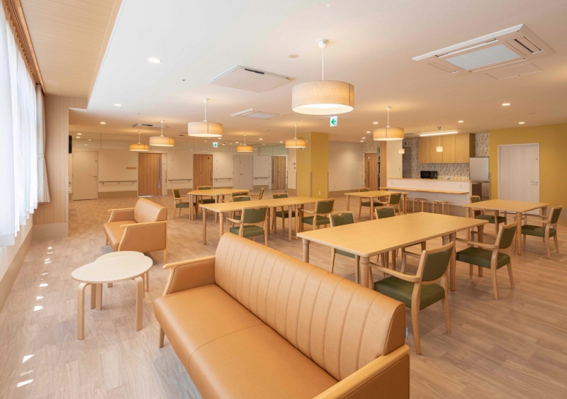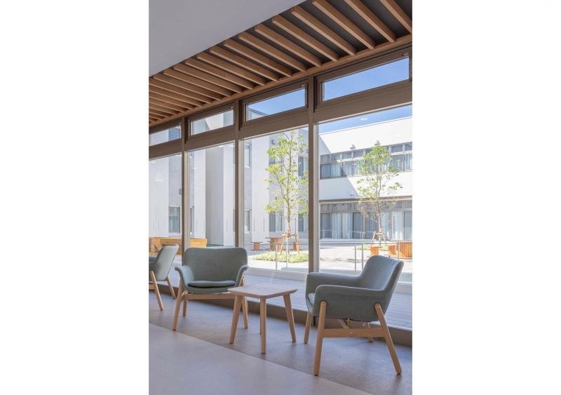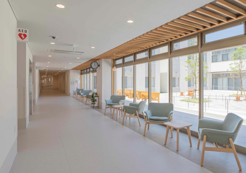 中庭に面したゆとりのある広い食堂や、廊下に談話コーナーなどをつくり面積や階高を抑えながらものびのびと過ごせる豊かな生活空間を作りました。