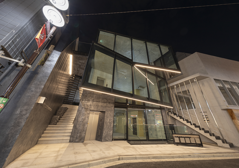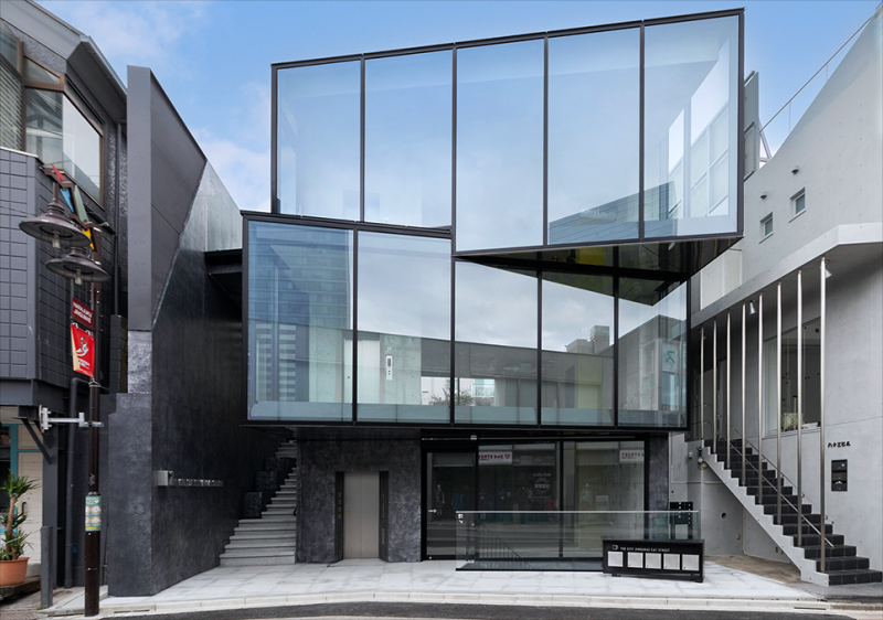 ■キャットストリートの屈曲点の立地を活かした交差するガラスファサード