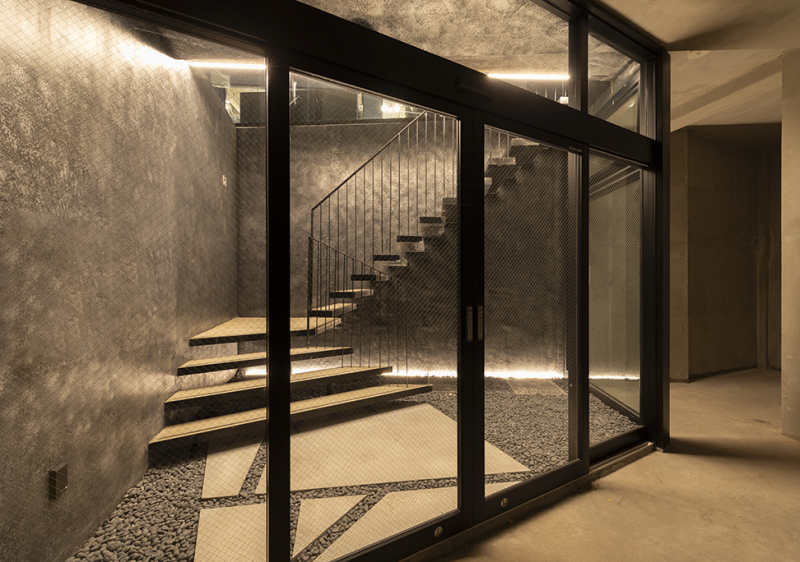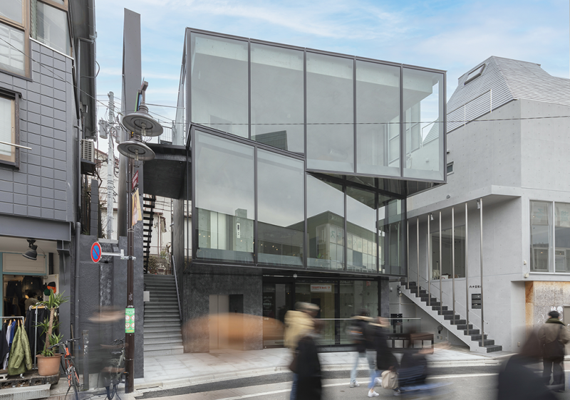 計画地は、前面道路のキャットストリートが緩やかな角度で屈折するポイントとなっており、双方の角度に沿わせるようにガラス面を交互に重ね、流れに沿いつつ逆方向の視線を受け止めやすい面を形成することで、店舗のショーウィンドーとして洗練されたイメージを構成しました。