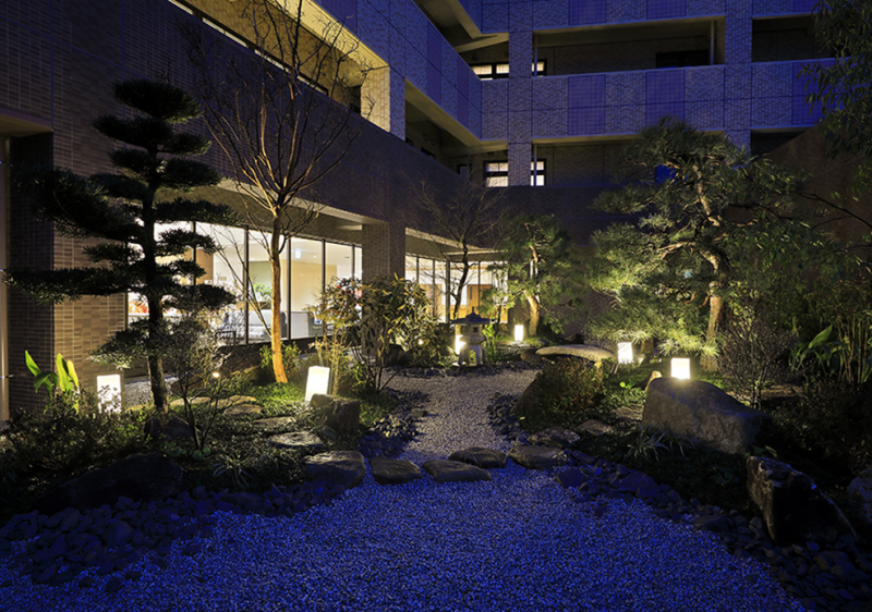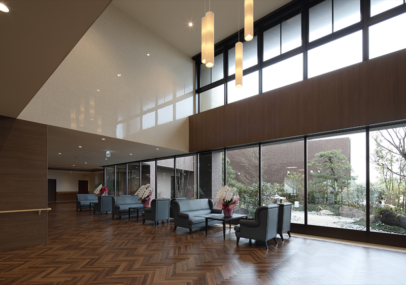 エッジングガラスの風除室を抜けた先では、吹抜ホール越しに日本庭園が来訪者を迎えます。