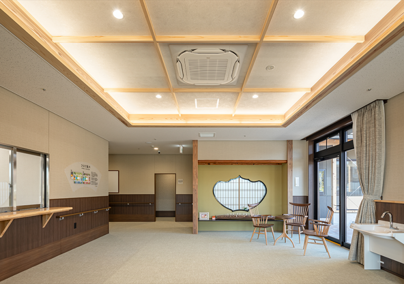 一歩入ると広がる共同生活室・談話コーナーは交流の場として京都の路地をイメージしました。
